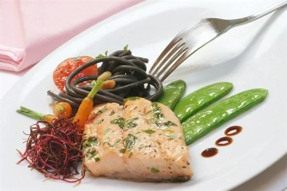 ШАГ 3 В кипящей подсоленной воде отварить лапшу. На подогретое сервировочное блюдо выложить лосось, овощи и лапшу. Добавить помидоры черри, посыпать листочками свежего орегано и сбрызнуть соевым соусом.