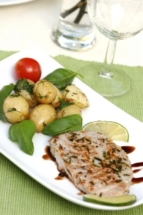 ШАГ 1 Стейки тунца выложить на поднос пароварки и полить соком половины лимона и 1 столовой ложкой оливкового масла и посыпать измельченной петрушкой. Посолить, поперчить по вкусу.