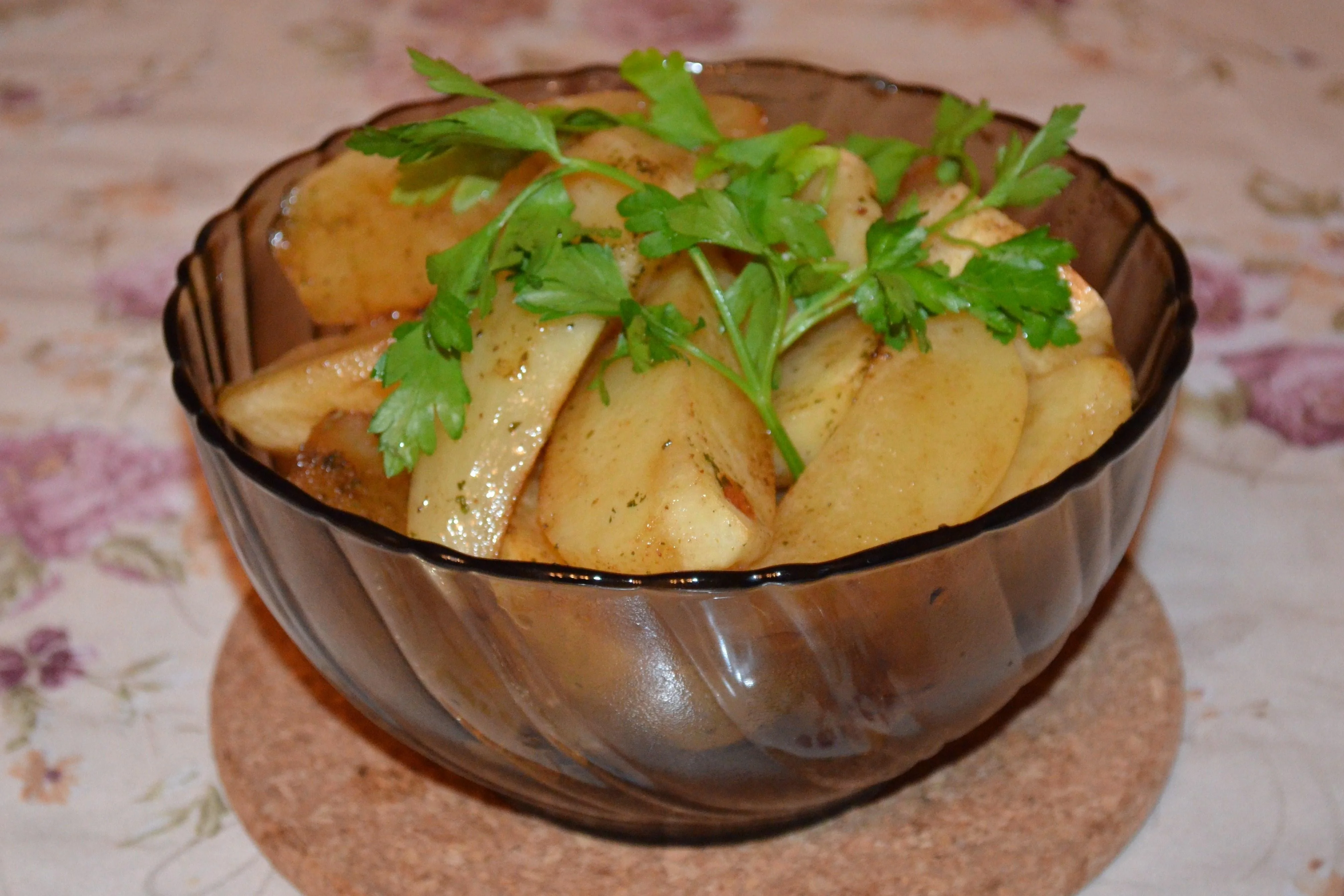 ШАГ 3 В разогретый жир выложить картофель (лучше, чтобы он был выложен в 1 слой), посолить по вкусу, посыпать сушеной зеленью петрушки, укропа, базилика, можно посыпать также специальной приправой для картофеля.