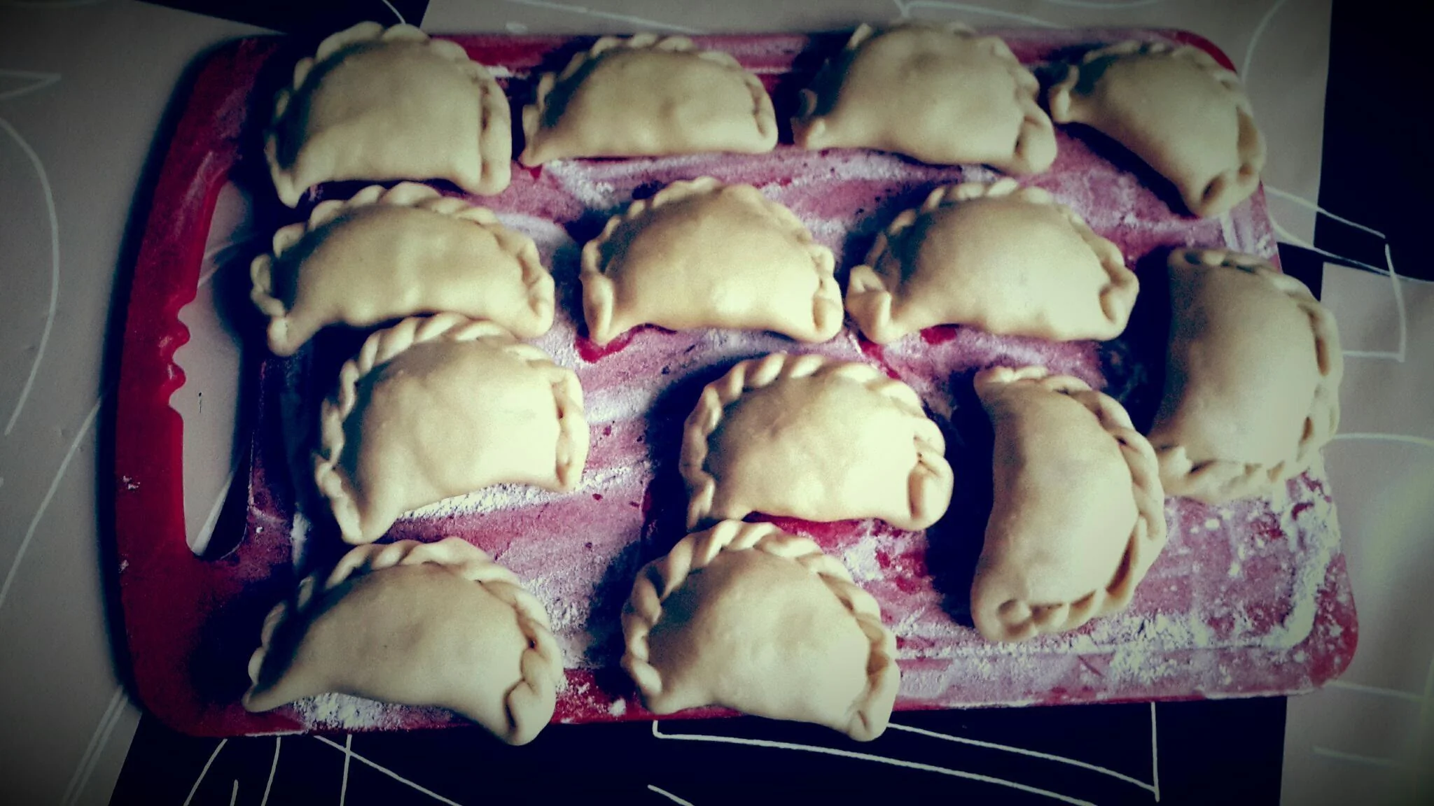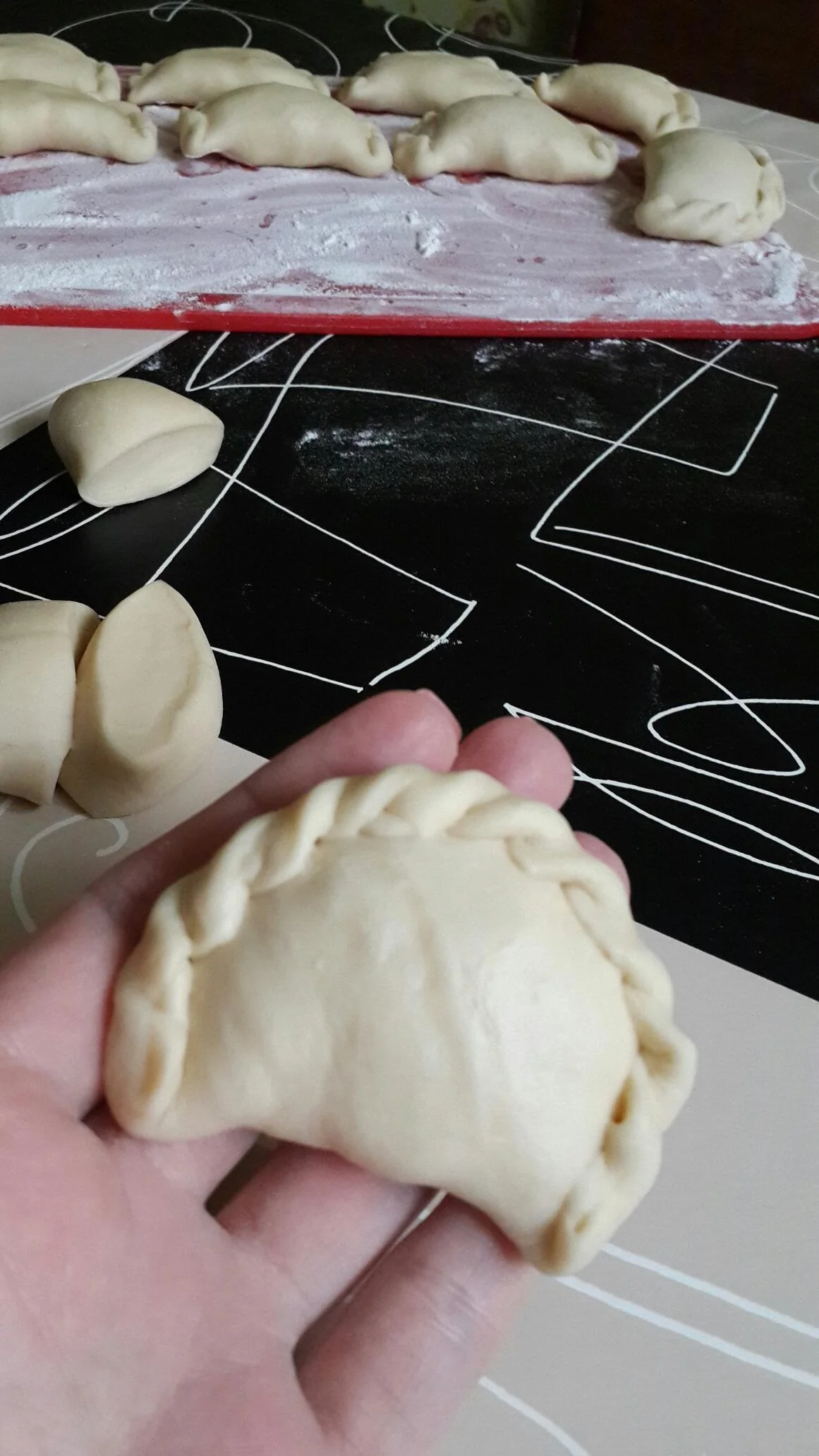 ШАГ 3 Готовое тесто разделить на 4 части, каждую часть скатать в жгут толщиной 2 см, нарезать на кусочки шириной 1,5 см и на присыпанной мукой поверхности раскатать их в тонкие лепешки. В центр каждой лепешки выложить по 1 ч. л. фарша, сложить кружок с начинкой пополам и узелком соединить концы.