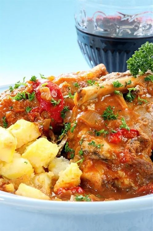ШАГ 2 Уменьшите огонь и добавьте мелко нарезанные лук и перец и измельченный чеснок и пассеруйте до мягкости 6 минут. Верните мясо в сковороду, залейте вином и выложите томаты. Посолите, поперчите и добавьте майоран. Накройте крышкой и тушите до мягкости, иногда переворачивая, примерно 2 часа. Откройте крышку и дайте соусу слегка загустеть, если необходимо.