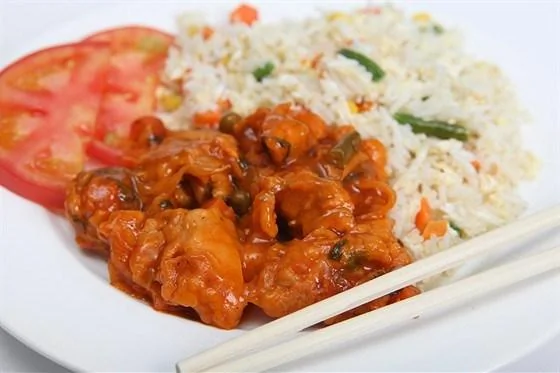 Сладкие куриные грудки во фритюре с зеленым луком, рисовым вином и цедрой апельсина