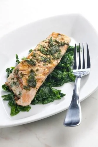 Лосось в бальзамической глазури со шпинатом, маслинами и изюмом