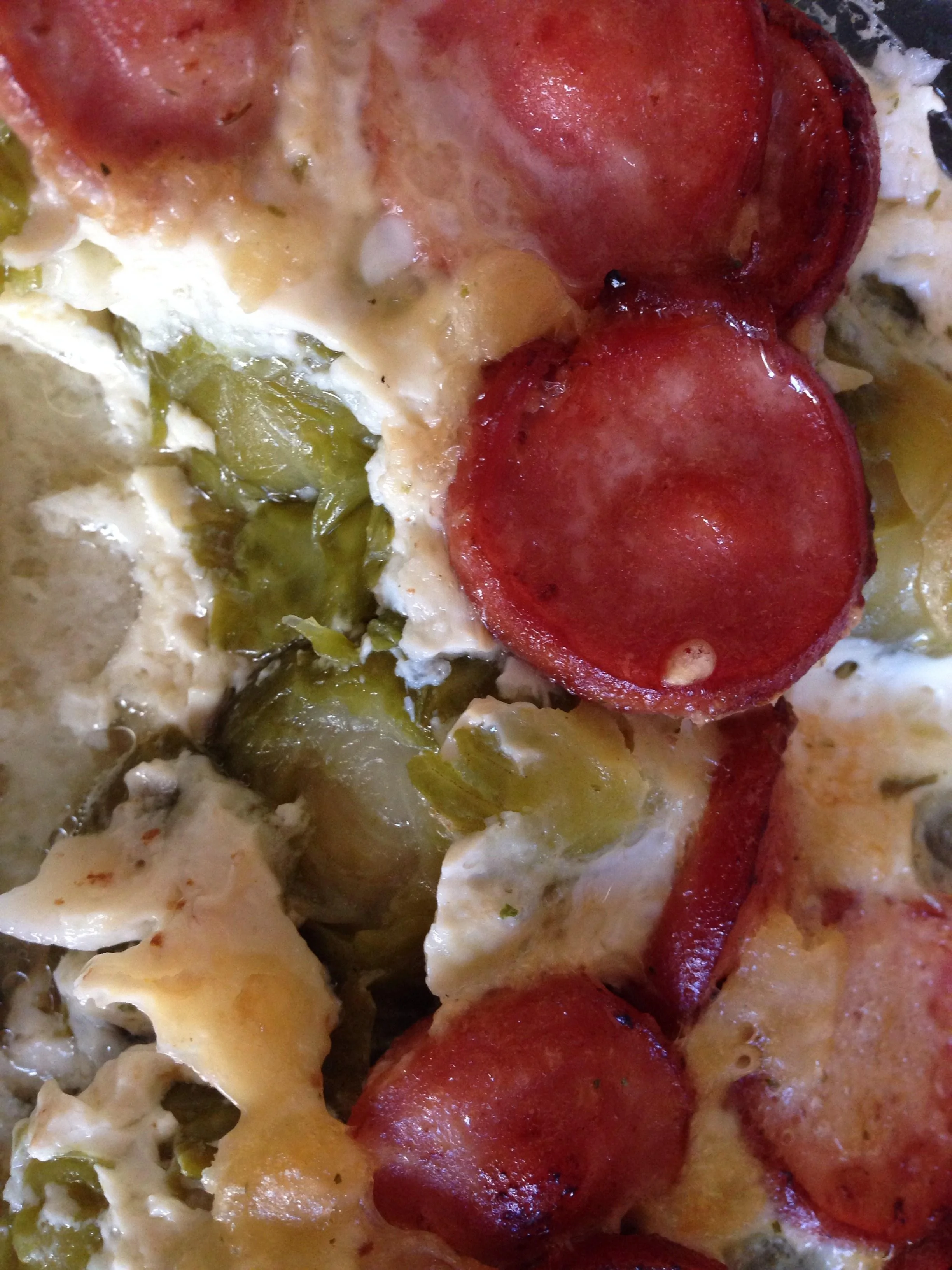 ШАГ 3 Уложить капусту с ломтиками сосисок в форму или посуду для готовки, залить соусом. Запекать в духовке в течение 15 минут.