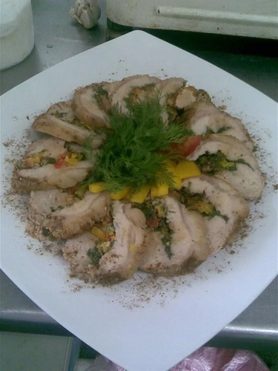 ШАГ 4 Получившийся рулет уложить на противень, запекать в жарочном шкафу, прикрыв фольгой при температуре 160 градусов С.