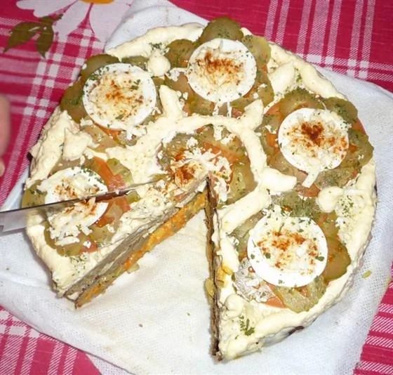 ШАГ 13 Кружочки помидоров выложить на торт в виде цветов, на них положить кружки яиц, из огурцов сделать листочки, свободное пространство засыпать сыром. По краю торта выдавить из шприца аккуратную каемку из желтково-майонезного крема. Украсить красным перцем, зеленью.