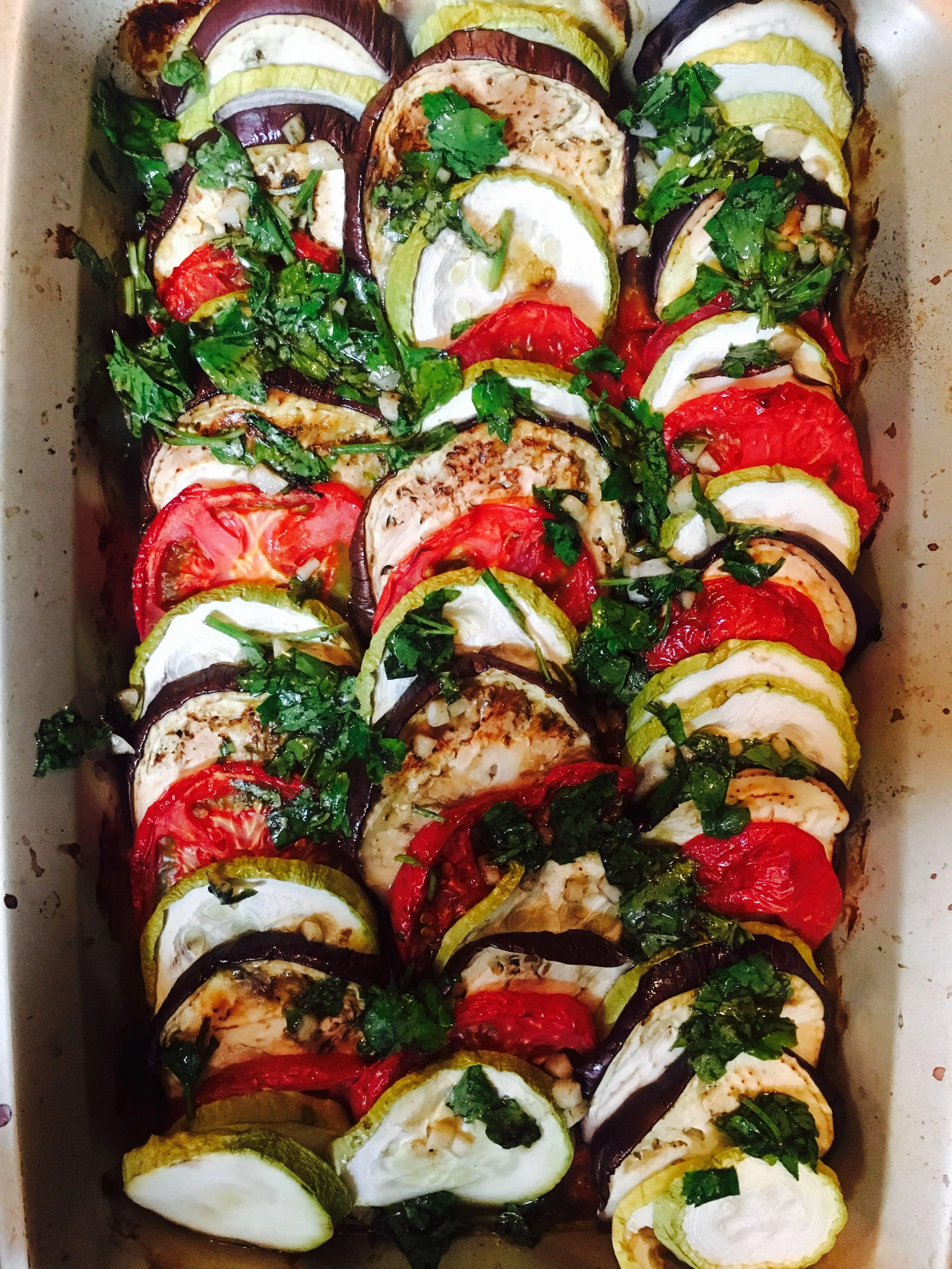 ШАГ 5 Перед самым финалом нарубить мелко петрушку, добавить оливкового масла, посолить, поперчить, добавить 2-3 зубчика измельченного чеснока и уксус. Смешать и равномерно распределить по поверхности готового рататуя.