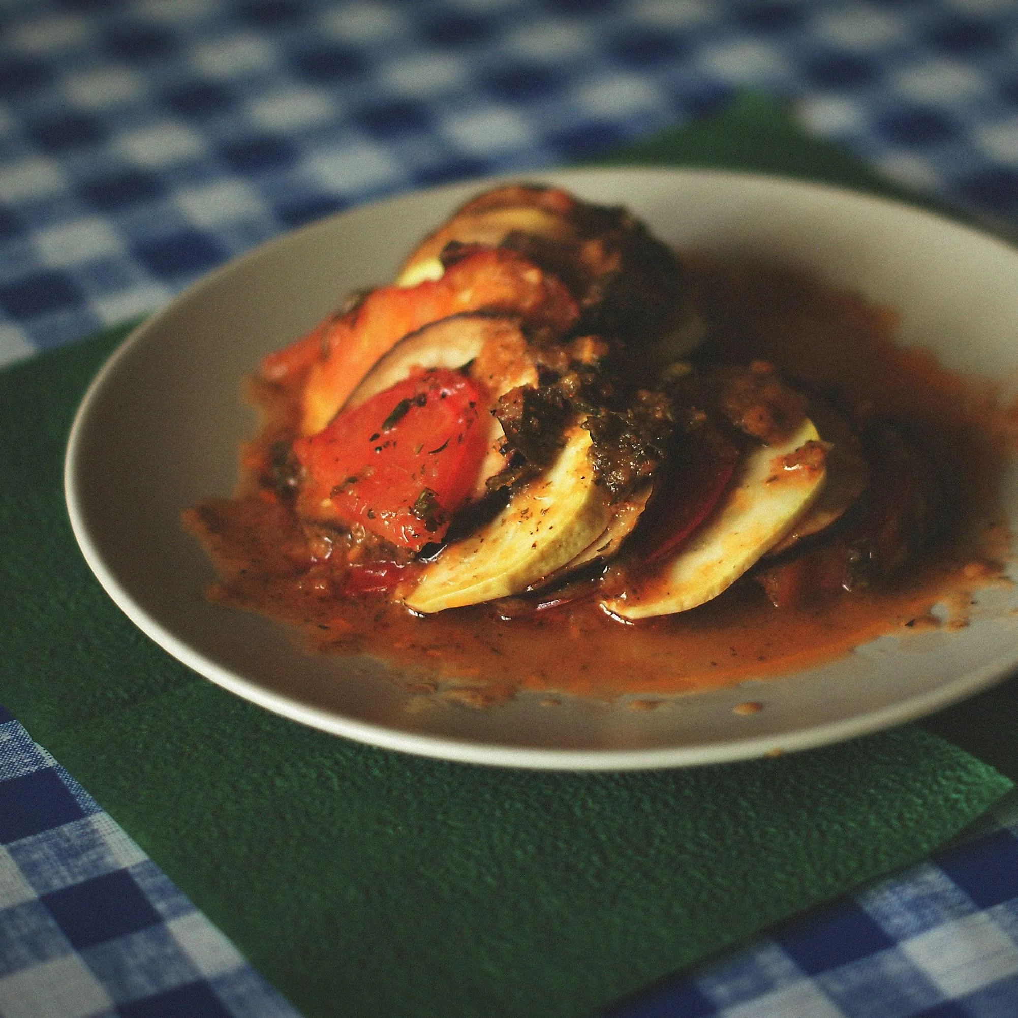 ШАГ 3 Баклажаны, помидоры и кабачки нарезать тонкими ломтиками. Когда помидоры и перец размягчатся, соус готов. Часть соуса выложить на дно противня. Затем красиво уложить ломтики помидоров, чередуя с ломтиками баклажанов и кабачков. Количество слоев может быть любым.