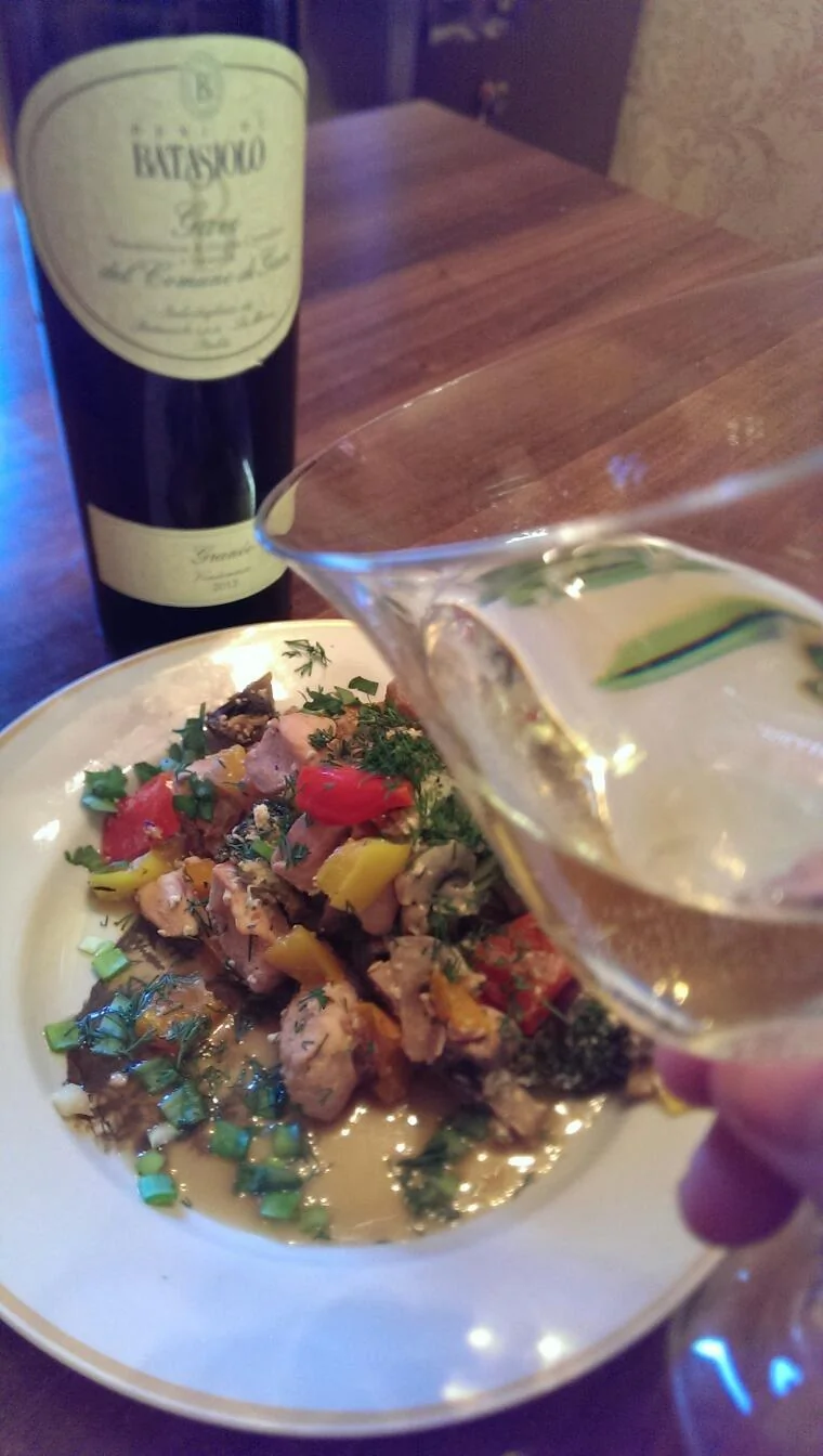 ШАГ 3 Влить вино и тушить 5 минут. Затем добавить шампиньоны, тимьян, брокколи, посолить и залить сливками. Накрыть крышкой и тушить 20-30 минут.