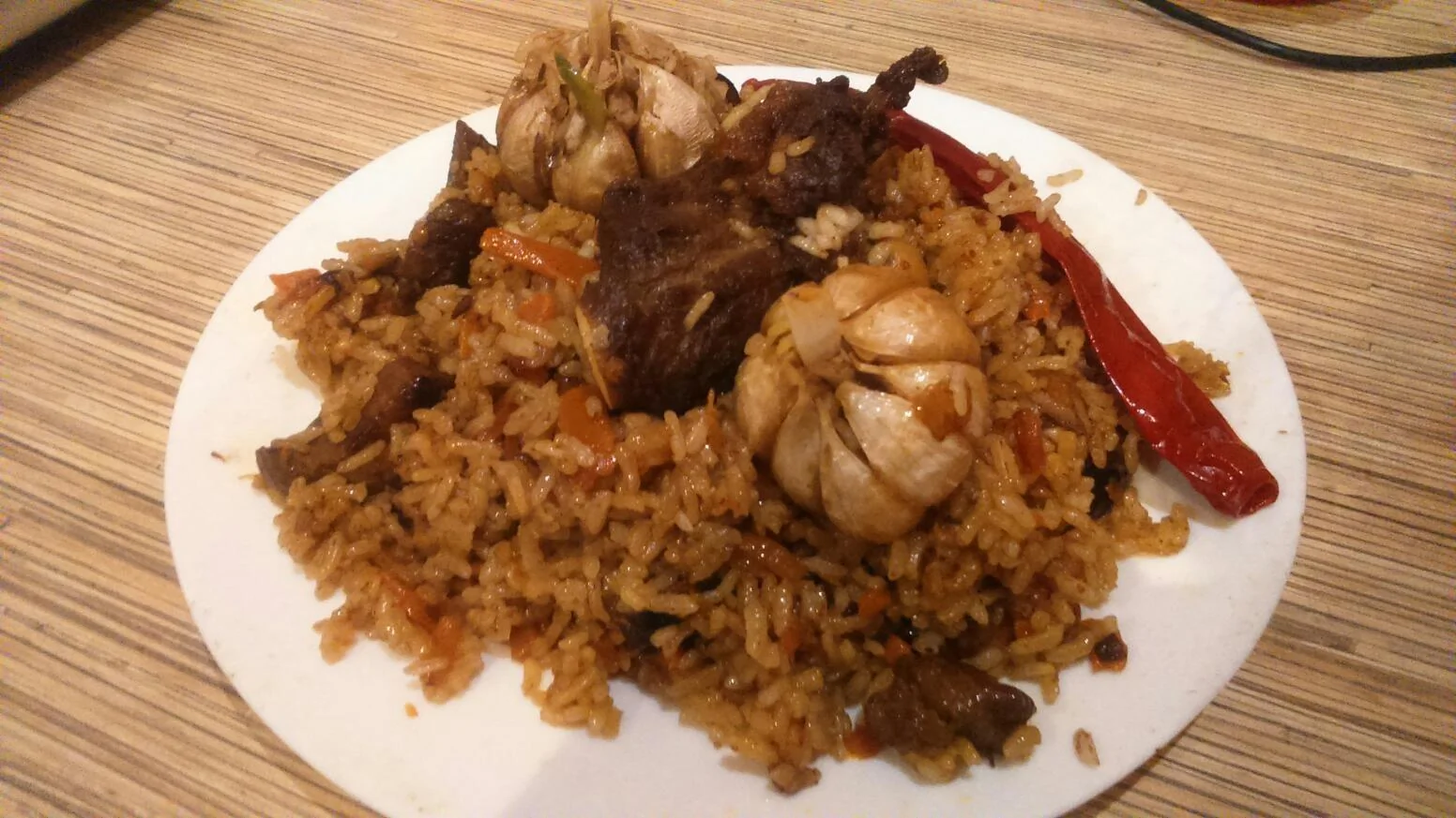 ШАГ 12 Теперь открываем наш казан. Достаем из него перец и чеснок и косточки. Хорошенько перемешиваем рис с овощами и мясом. Выкладываем плов на тавак (большое круглое блюдо, желательно глиняное). Сверху украшаем косточками, чесноком и перчиком.