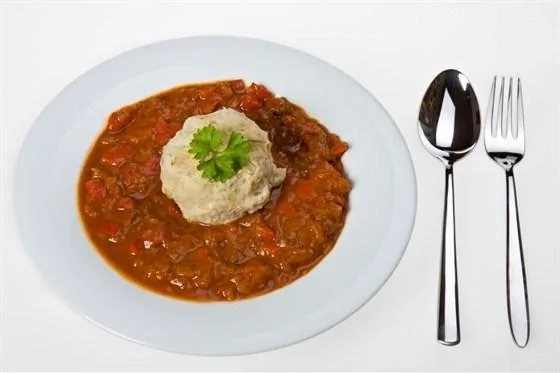 ШАГ 2 В конце тушения положить зеленый перец, помидоры и довести до кипения. Затем блюдо заправить сметаной, смешанной с пассерованной мукой, и еще раз прокипятить. Подать с мучными клецками.