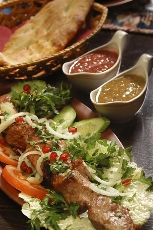 Лук репчатый Свинина Белое сухое вино Чача Морская соль Перец черный молотый Растительное масло Основные блюда Грузинская кухня