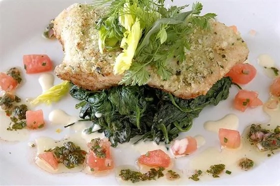 Лосось в сливочно-винном соусе с теплым шпинатом