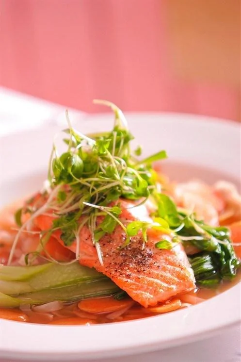 ШАГ 1 Промойте семгу, разделайте на филе, нарежьте порционными кусками и замаринуйте на 10 - 15 минут. Для маринада взбейте кунжутное масло с соевым соусом. Добавьте соус чили, мелко порубленный чеснок, имбирь и соль.