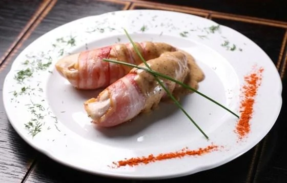 ШАГ 1 Мясо очистить от пленок, нарезать поперек волокон, хорошо отбить, посолить. На каждый ломтик положить 2–3 кусочка шпика, посыпанного растертым тмином, плотно завернуть ломтик и связать ниткой.
