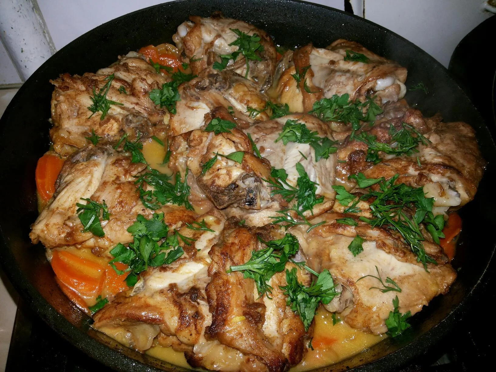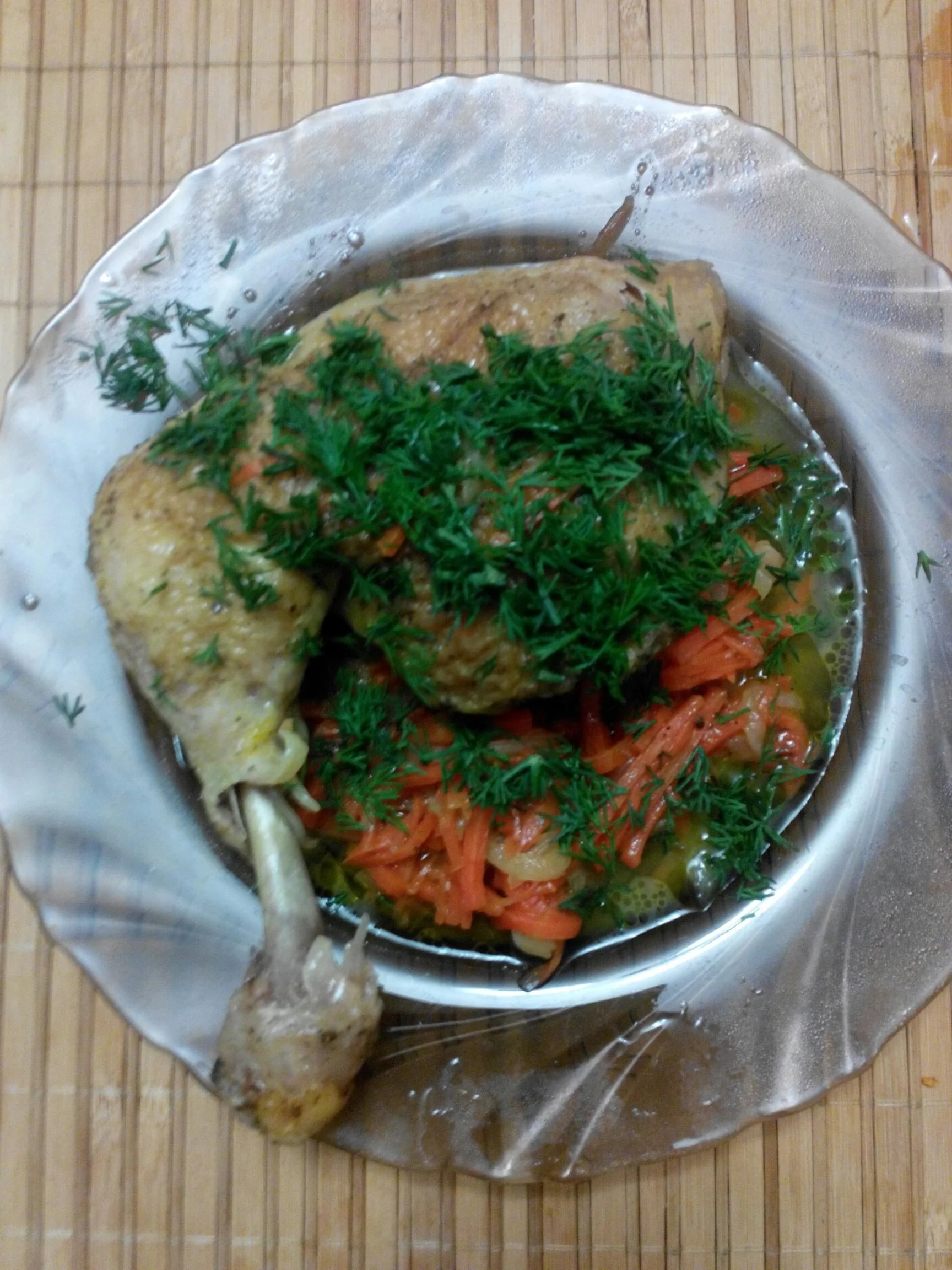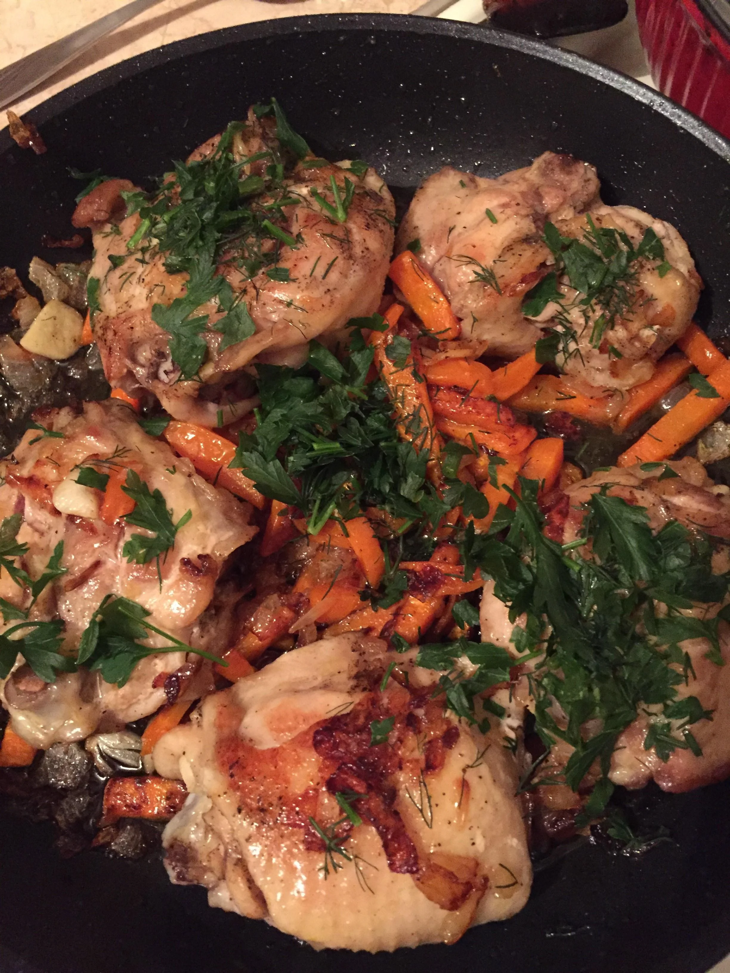 Кисло-сладкие куриные бедрышки с морковью и зеленью