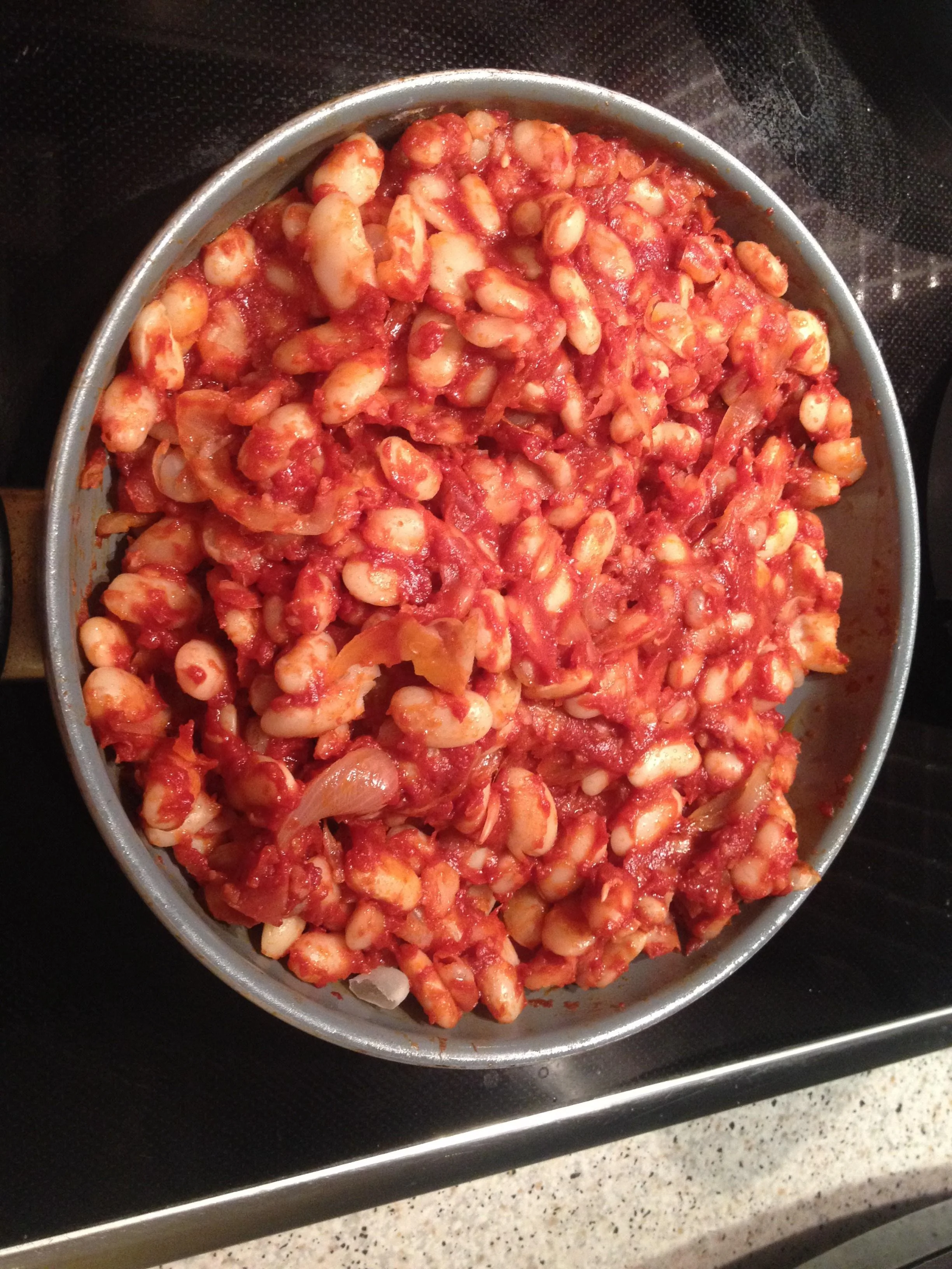 ШАГ 2 Воду слить, добавить поджаренный в масле лук, томат-пюре, посолить, перемешать и прогреть.