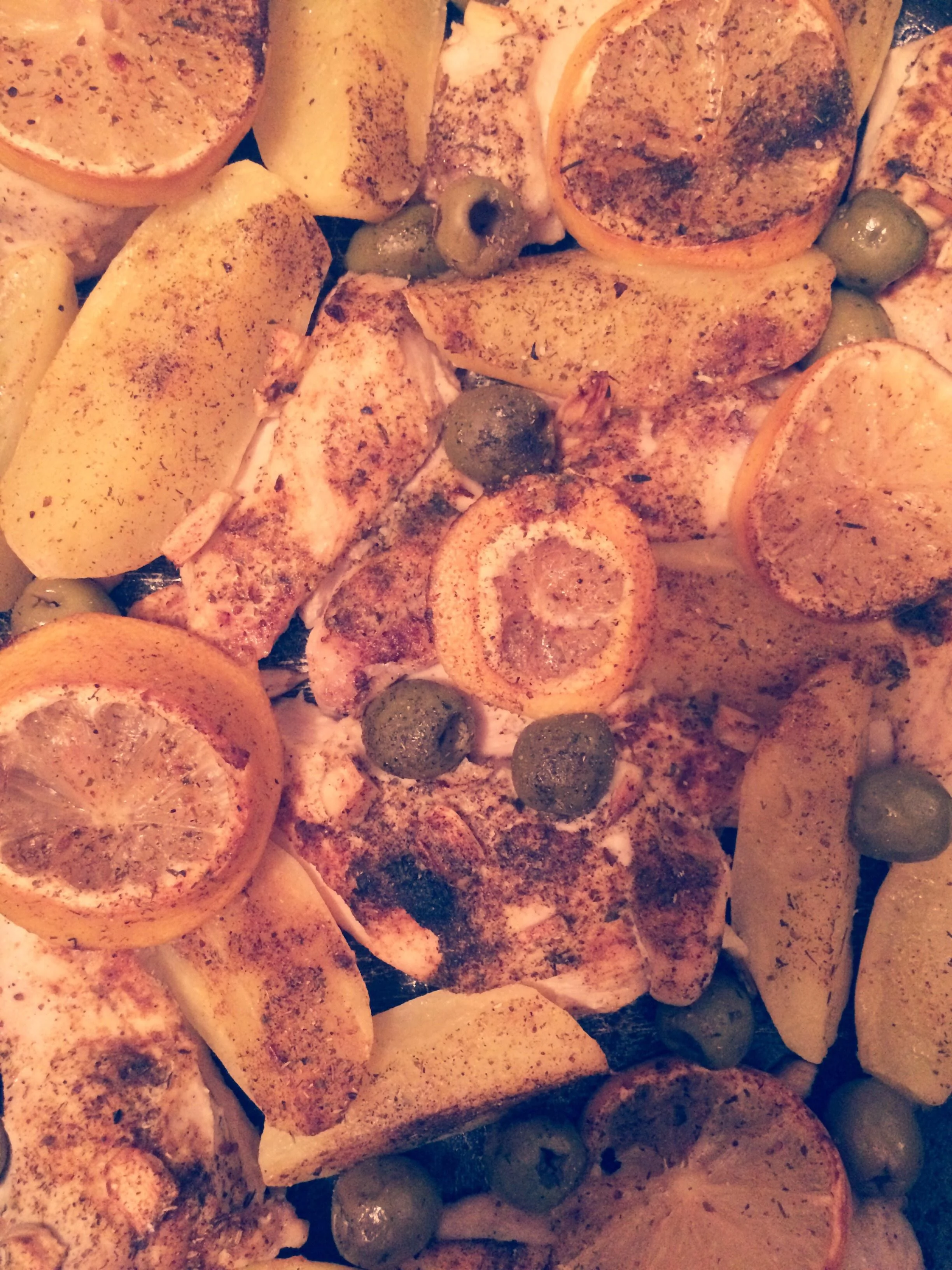 ШАГ 1 Разогрейте духовку до 200 градусов. Возьмите среднюю форму для запекания, смажьте ее оливковым маслом и разложите куски курицы. Разрежьте лимон пополам и выдавите сок из обеих половинок на курицу, затем положите половинки лимона в форму.