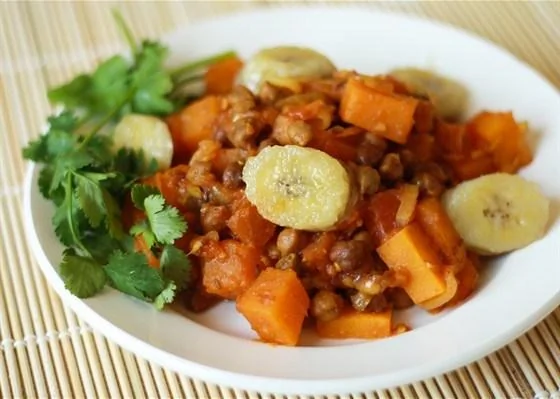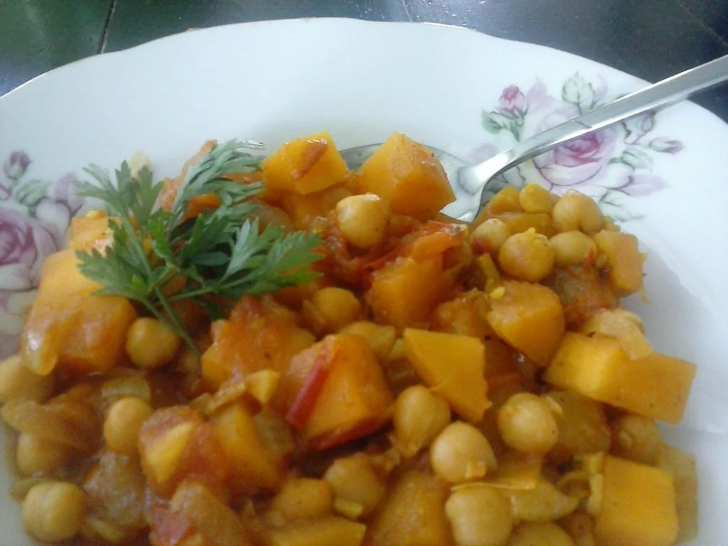 ШАГ 6 Тыкву нарезать крупными кубиками, добавить к овощам, залить 2/3 стаканом воды и тушить минут 10.
