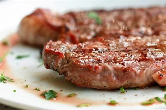 ШАГ 1 Мясо слегка отбить, натереть солью и перцем, полить растительным маслом и оставить на полчаса на блюде. Положить на сковороду или в жаровню с сильно разогретым сливочным маслом и поджарить с обеих сторон до образования поджаристой корочки, но чтобы внутри антрекот оставался слегка сырым.