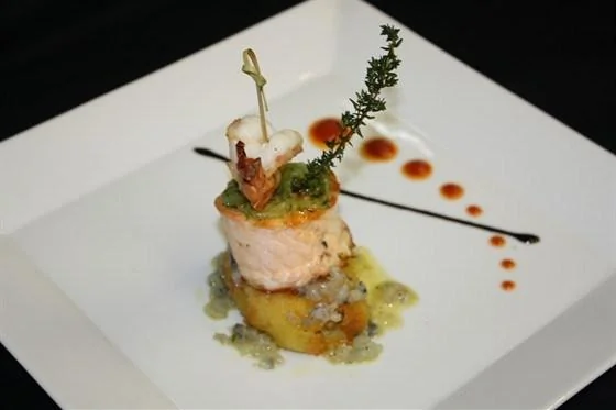 ШАГ 5 Крокеты выкладываем на тарелку, на них кладем лосось, поливаем огуречным дрессингом, сверху кладем обжаренную креветку. Украшаем бальзамико, красным песто, тимьяном.
