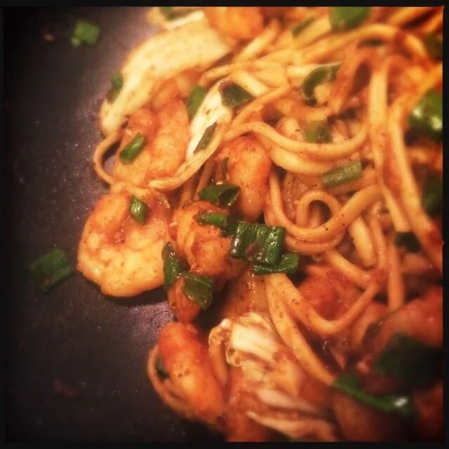 ШАГ 2 Добавляем порезанный зеленый лук и очищенные тигровые креветки и обжариваем еще 2–3 минуты.