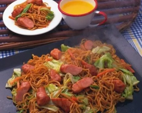 ШАГ 1 Отварить лапшу, сосиски. Сосиски разрезать на четыре части, смешать с лапшой, добавить соевый соус и фактически перед подачей кинуть порезанные листья салата и перемешать.