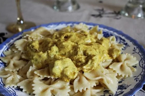 ШАГ 3 Залейте сливками и потушите 15-30 минут на слабом огне. Уложите на блюдо бантики и полейте сверху сливочным соусом.