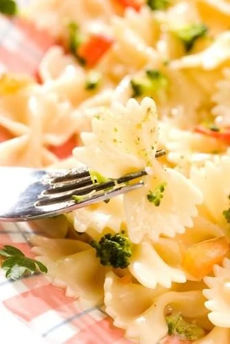 Детский салат с пастой, брокколи, кукурузой и луком-пореем