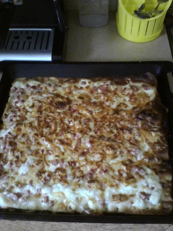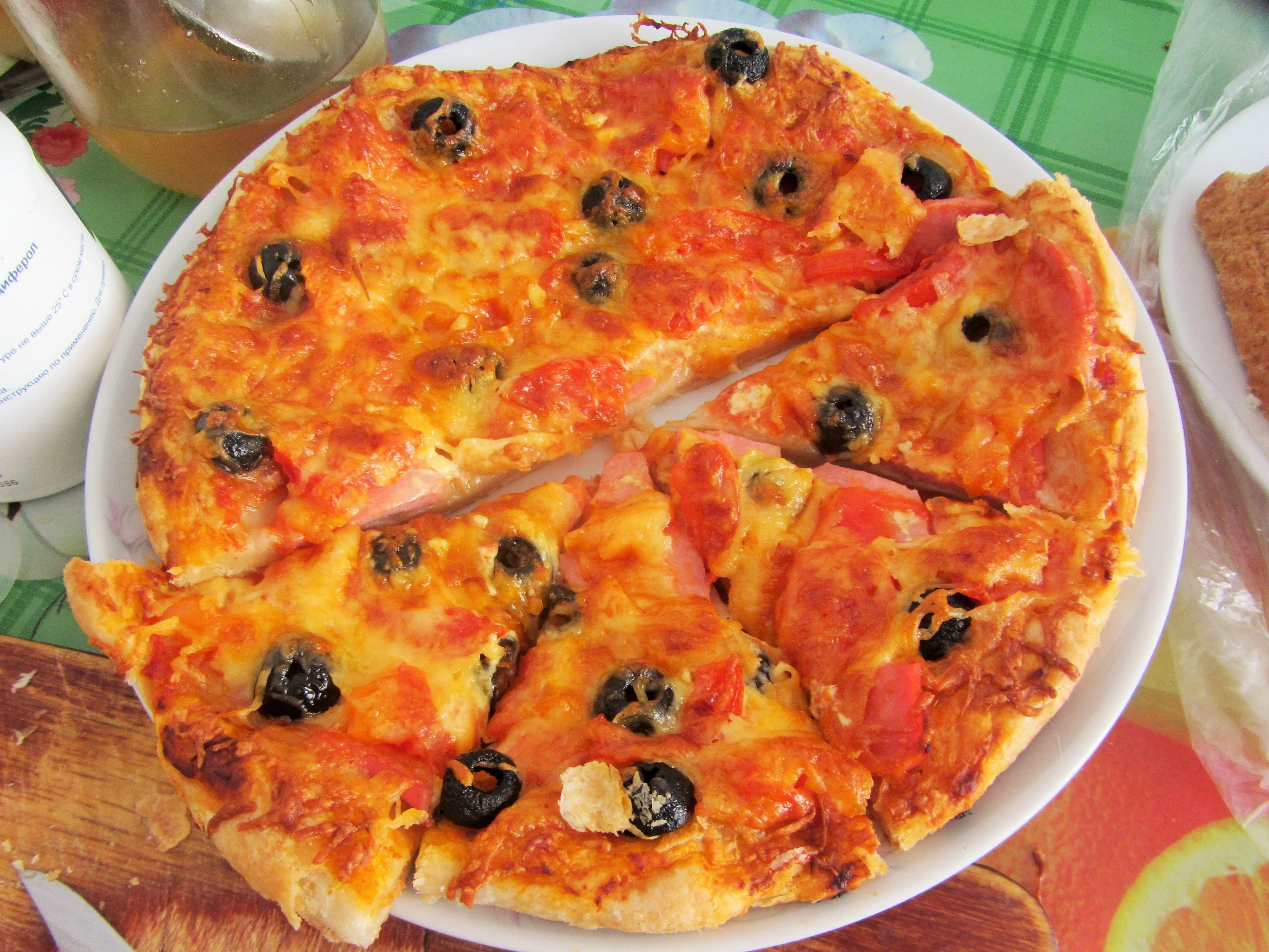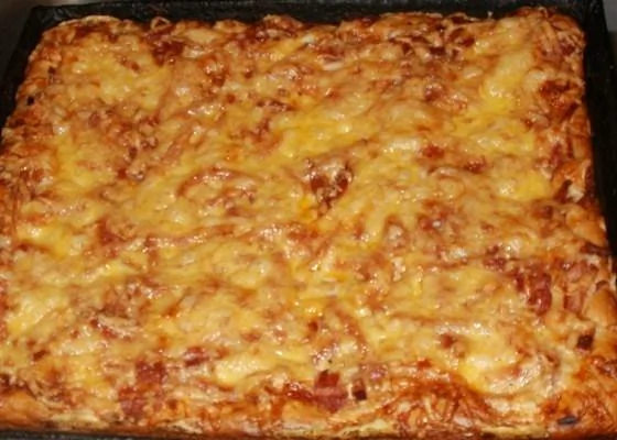 ШАГ 4 Раскатанное тесто смазываем кетчупом и майонезом. Выкладываем колбасу и сладкий перец. Сверху посыпаем сыром и запекаем в хорошо разогретой духовке до готовности.