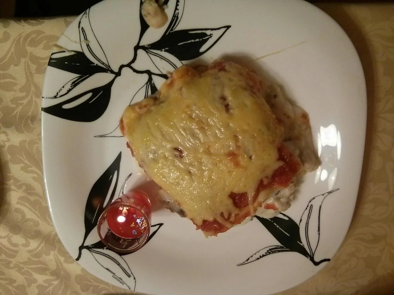 ШАГ 6 На листы выложить половину грибов с филе. -> Затем половина соуса -> Листы лазаньи -> Оставшиеся грибы с филе -> Оставшийся соус -> листы лазаньи -> помидоры с зеленью