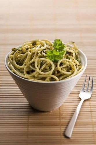 Зеленые спагетти с песто из спаржи и кедровых орешков