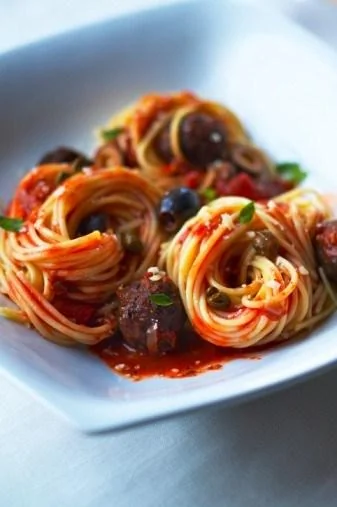 ШАГ 3 К подрумяненному чесноку добавить оливки, каперсы и томаты.