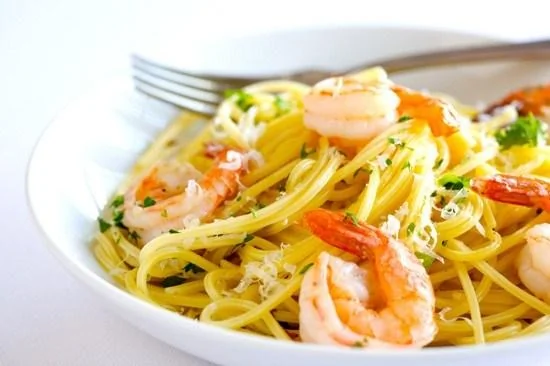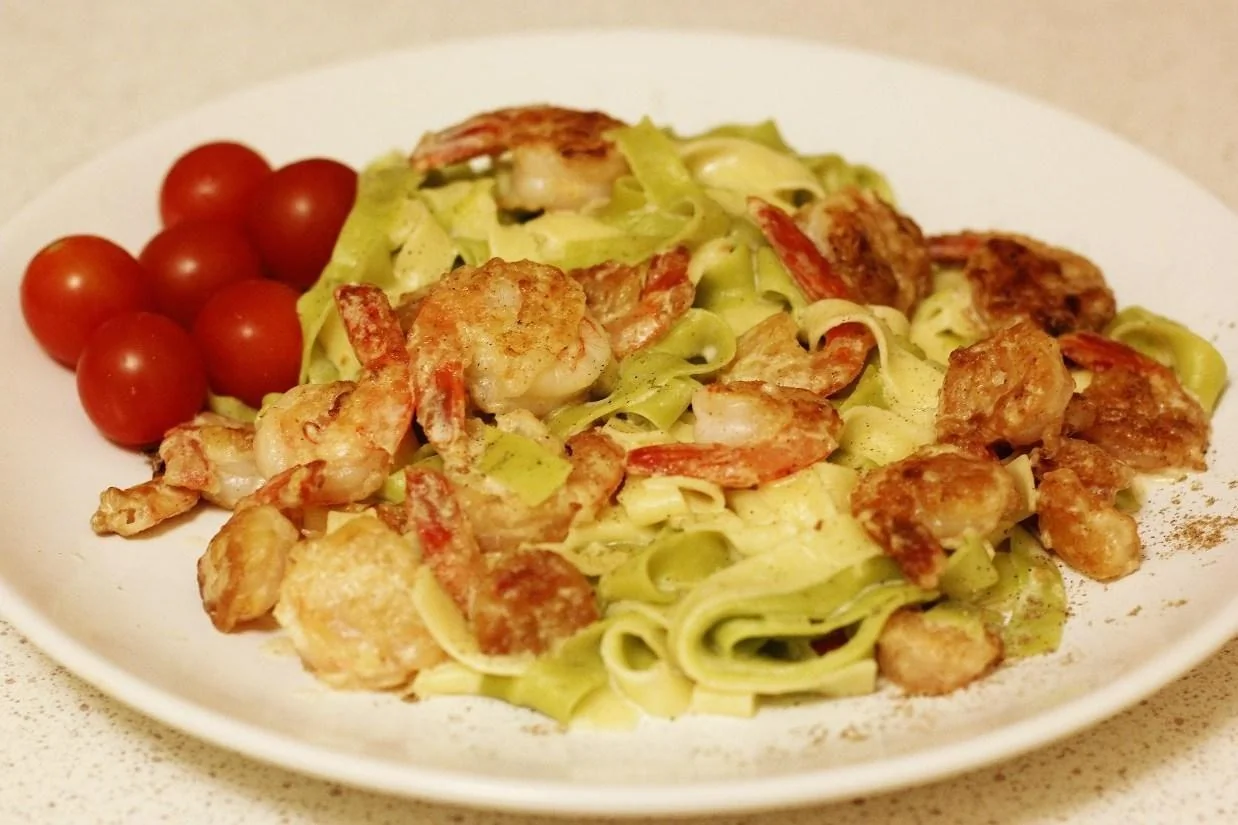 ШАГ 9 В приготовленный соус из креветок положить сваренную пасту, добавить цукини, чеснок и слегка посыпать пармезаном.