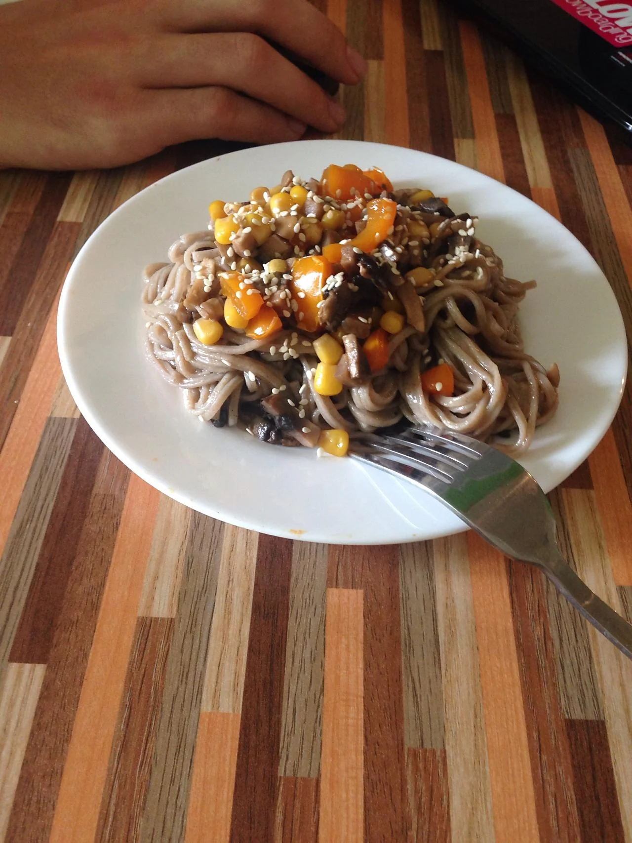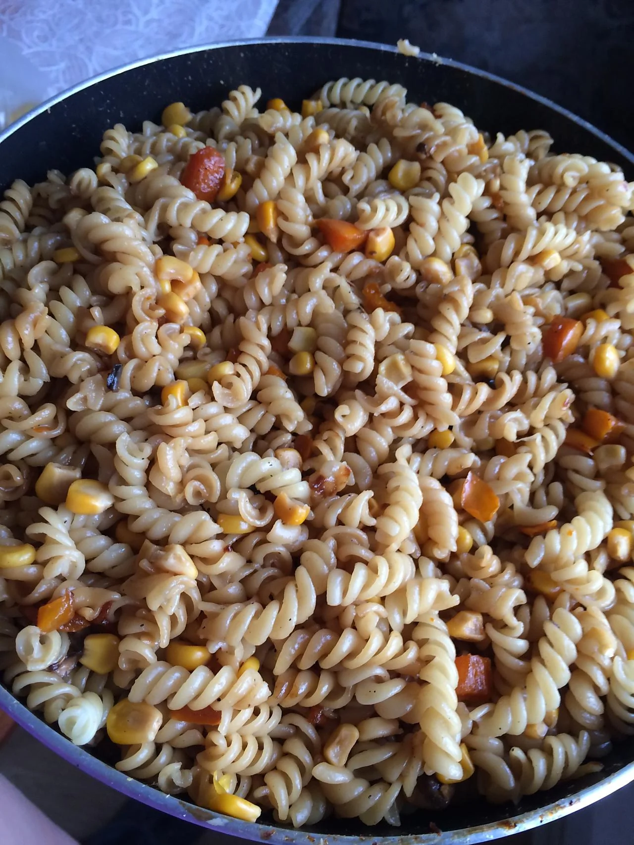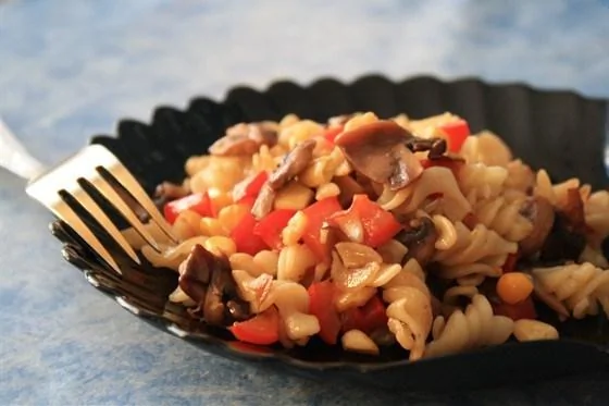 ШАГ 4 Готовые макароны выкладываем на сковородку к грибам и перцам, буквально 2–3 минуты прожариваем, закинув туда где-то половину банки кукурузы. Все готово, мне вкус очень напомнил ризотто, только без риса и курицы.