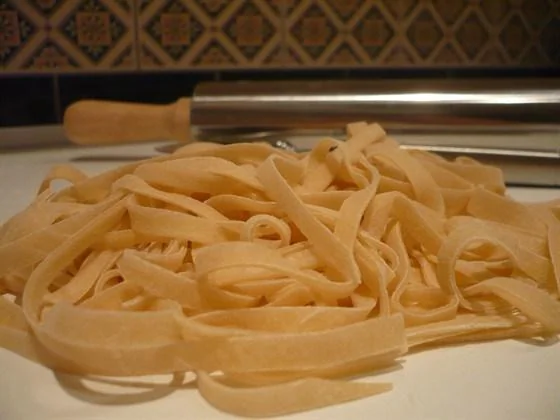 ШАГ 3 Теперь тесто нужно раскатать и нарезать. Это самое интересное, поскольку здесь можно делать, что угодно — хоть простые лингвини, хоть бантики, если времени не жалко или есть необходимость в антистрессовых мероприятиях. У меня времени на бантики не было, поэтому я делала нечто среднее между феттучини и лингвини. Для этого тесто раскатывала до толщины чуть меньше миллиметра, а потом резала его ножом для резки пиццы (очень удобно и быстро получается, если вы не сильно переживаете, что паста не будет как из магазина, ровненькая-преровненькая, а будет самая что ни на есть домашняя — немного разнокалиберная, но зато своя).