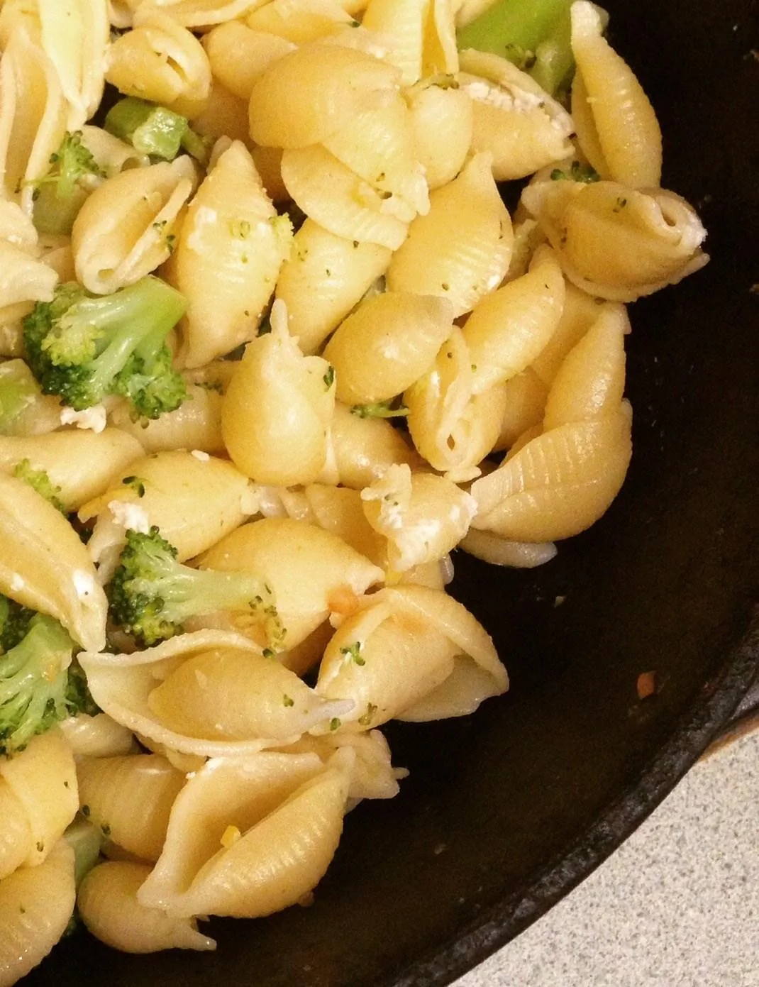ШАГ 3 Параллельно в глубокой сковородке на оливковом масле обжарить чеснок с мелко нарезанным острым перцем. Добавить цедру и сок лимона, а также соцветия брокколи. Готовую пасту смешать на сковородке с овощами и наломать туда же козьего сыра.