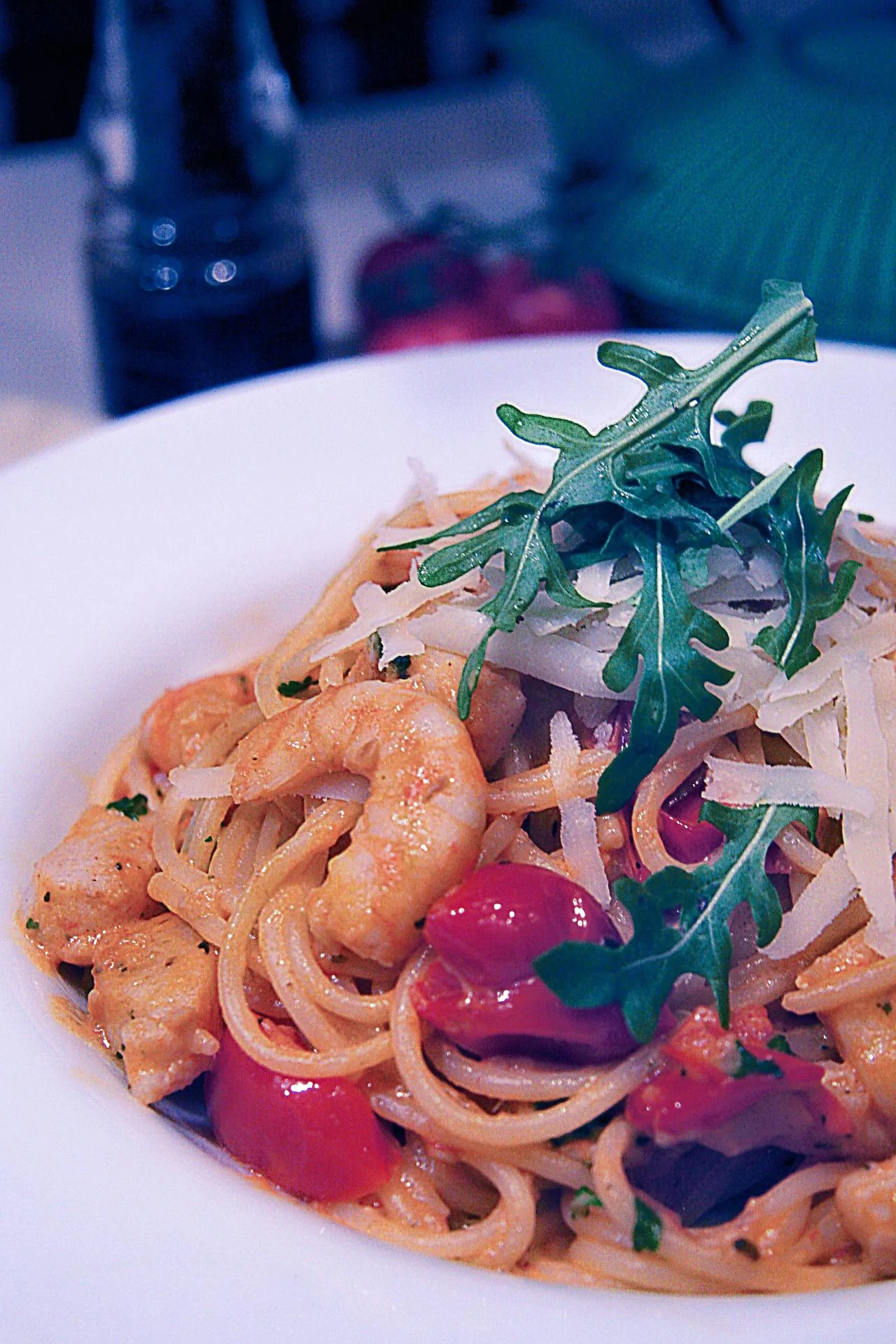 ШАГ 6 Соединяем спагетти с готовым соусом, посыпаем тертым сыром, добавляем рукколу и сразу подаем.