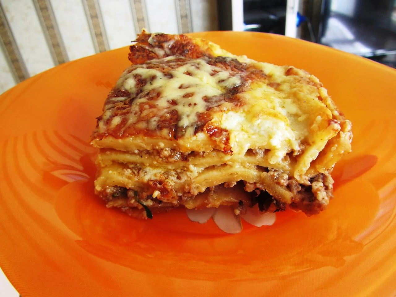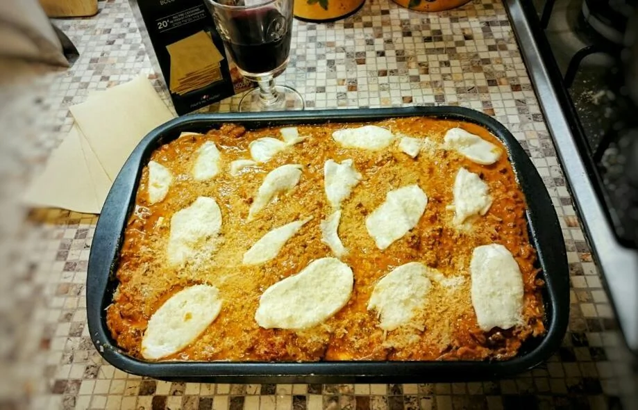 ШАГ 4 Глубокий противень смазать сливочным маслом, влить на дно немного соуса, равномерно распределить его. Выложить пласты, затем — слой соуса, нарезанную тонкими кружочками моцареллу и тертый пармезан. Повторить то же самое два раза, то есть верхним слоем должен быть соус плюс сыр.