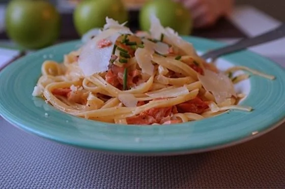 ШАГ 3 Добавить томаты и лосось, готовить 10 минут.
