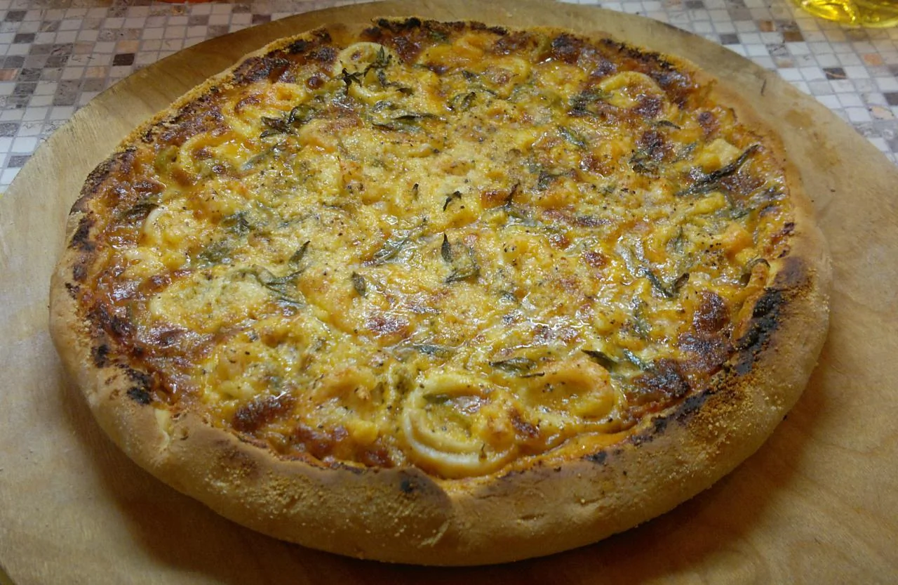 Пицца с кальмарами и креветками на тонком тесте из двух сортов муки