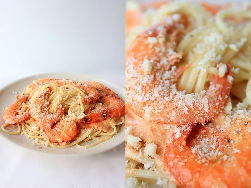 Спагетти с креветками в сливочно-томатном соусе с хлебно-чесночной крошкой