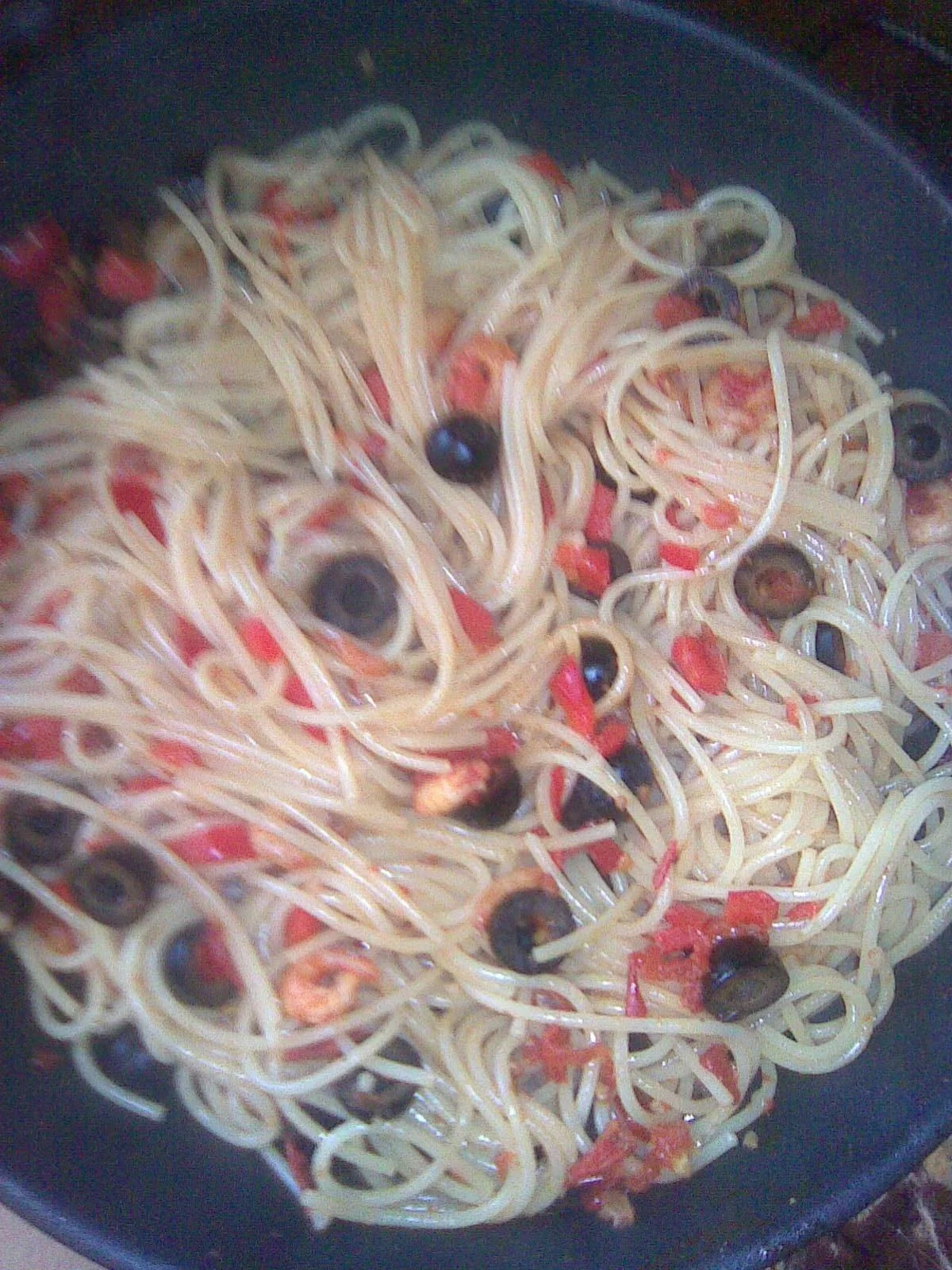 Спагетти с креветками и маслинами
