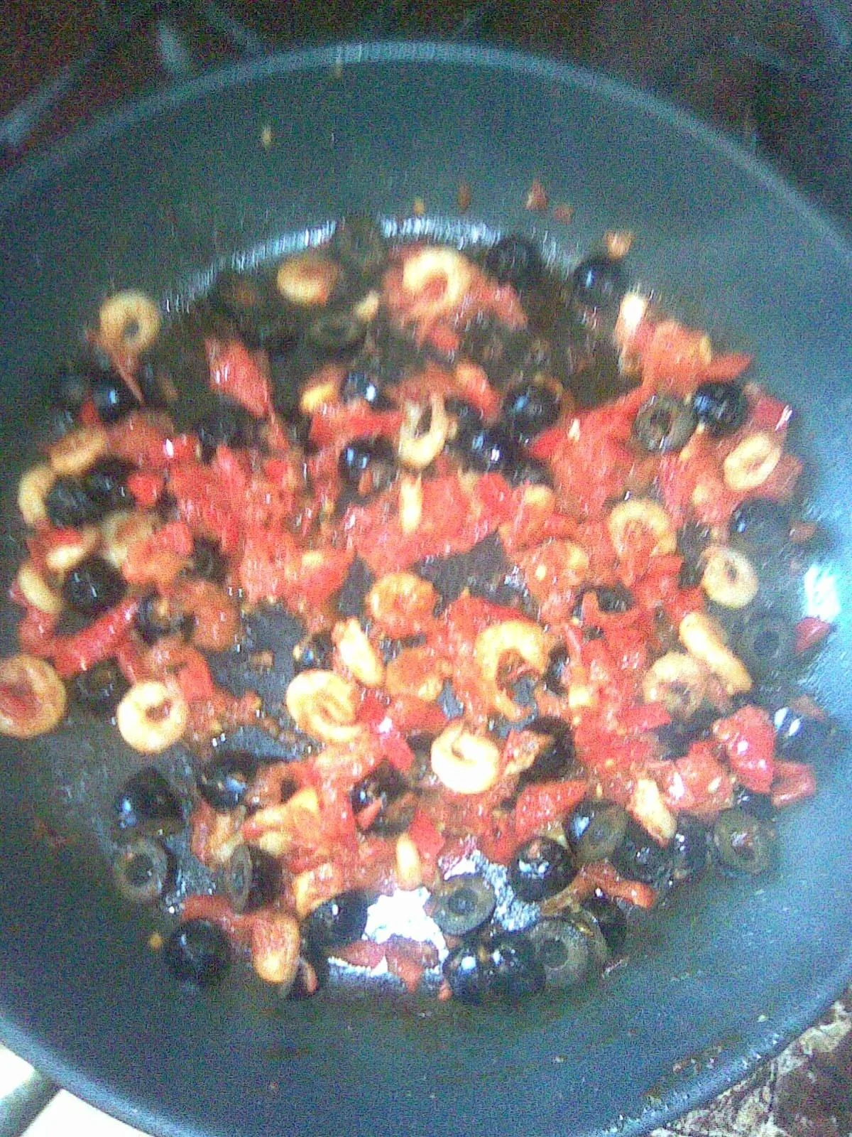 ШАГ 4 Затем добавить мелко нарезанный перец, через минуты 2 — помидоры и напополам порезанные маслины. Обжарить минут 5–7.