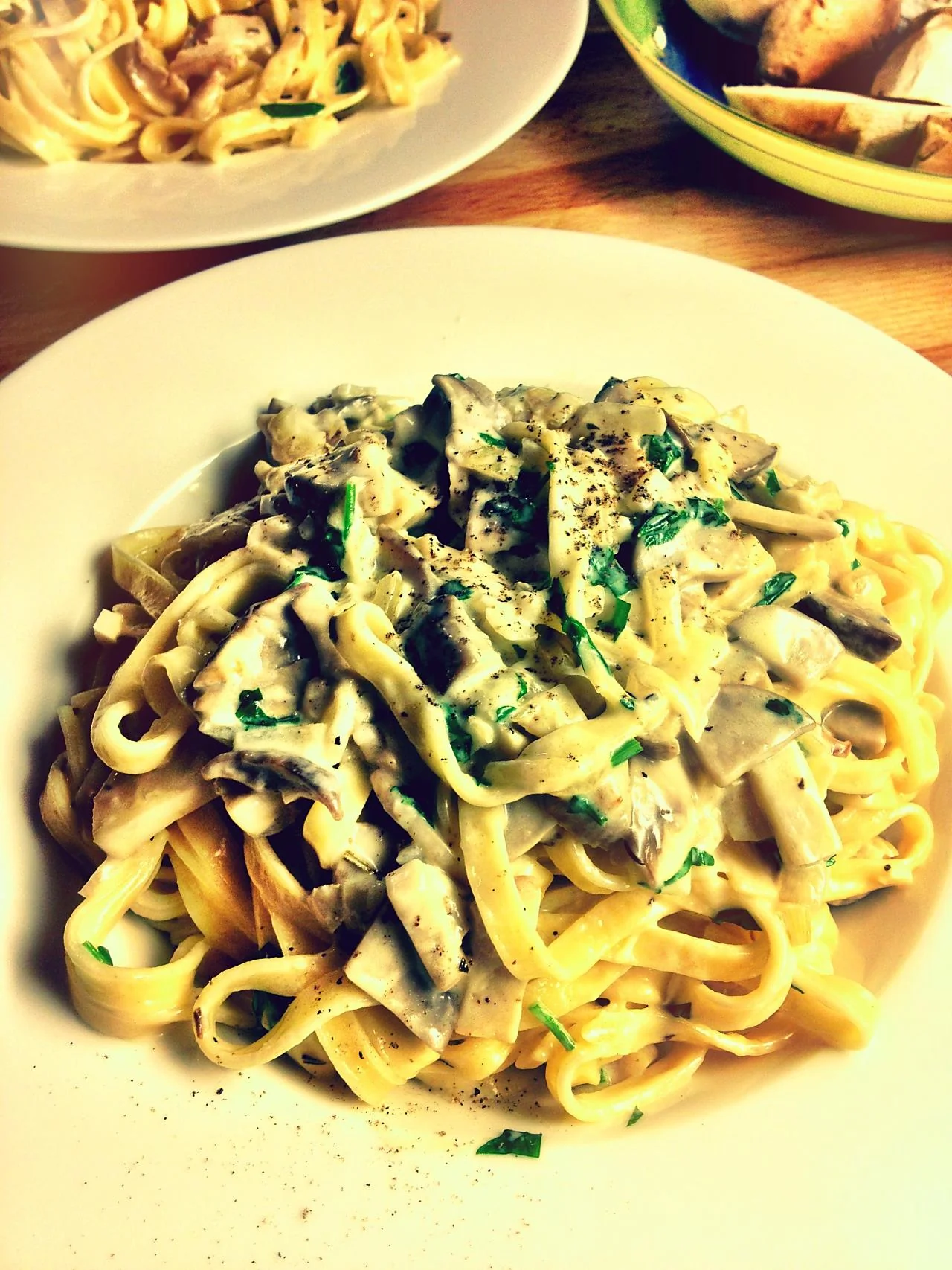 ШАГ 5 Отправляем феттучини в сковороду, аккуратно перемешиваем пасту, добавляем оставшуюся воду, рубленную петрушку, сок половины лимона, свежемолотый перец, и даем настояться 2 минуты на минимальном огне. Подавать лучше в глубокой, теплой тарелке.