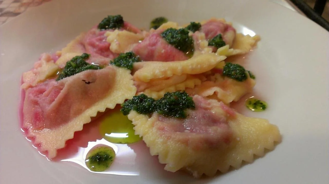 Равиоли со свеклой, рикоттой, пармезаном и чесночным соусом