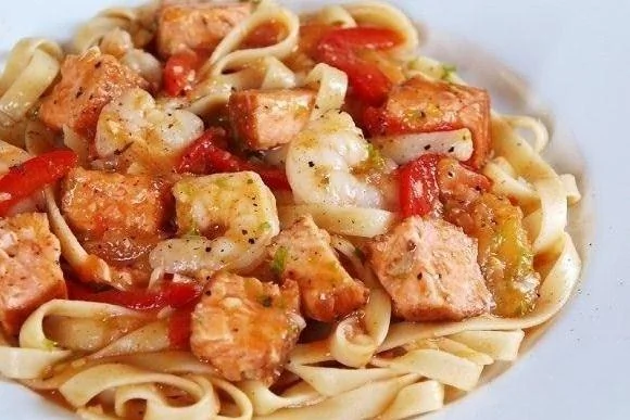 Ингредиенты для приготовления Фетуччини с острыми креветками и лососем: