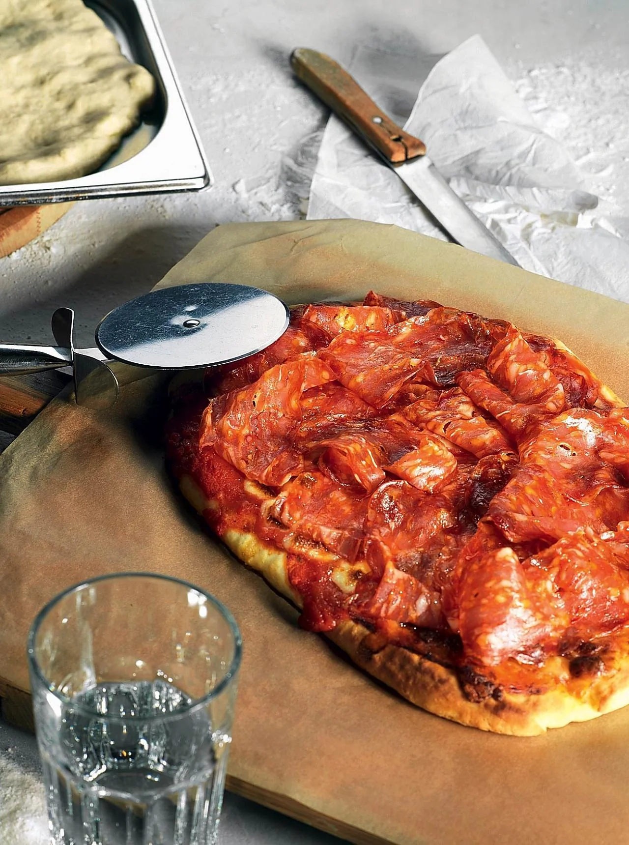 ШАГ 4 Тем временем нарезать салями — хотя можно попросить нарезать ее на слайсере в магазине, чтобы ломтики были тоньше. На готовую пиццу выложить, слегка скручивая, ломти колбасы — и немедленно, пока пицца не остыла, подавать.