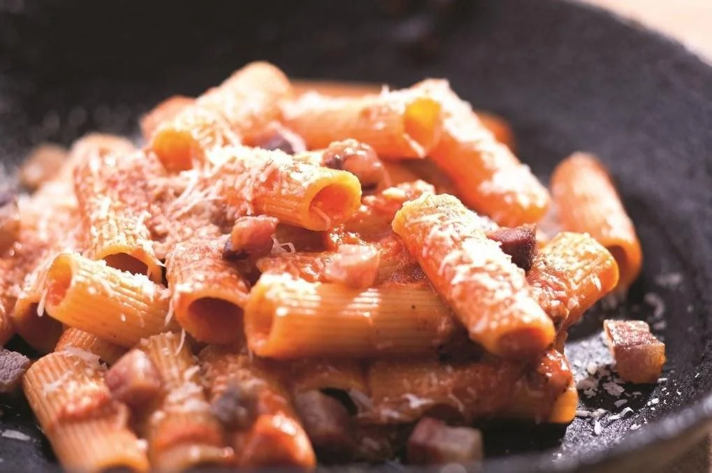 ШАГ 6 На последнем этапе, когда паста (соус) объединилась и сплелась с пастой (мучной), украшаем все это оставшейся щекой + 10 граммов пекорино.