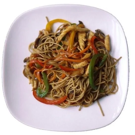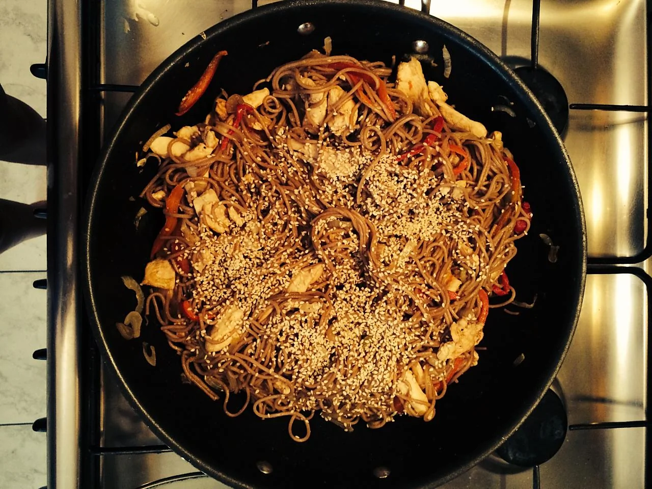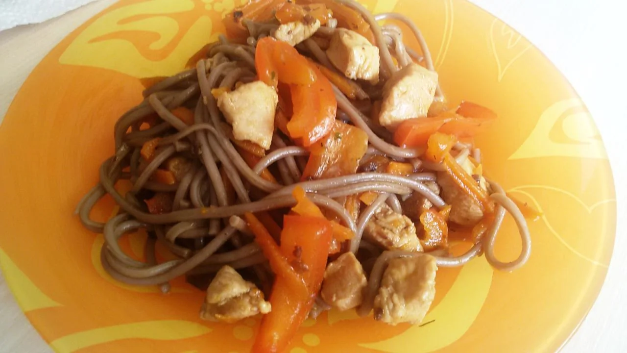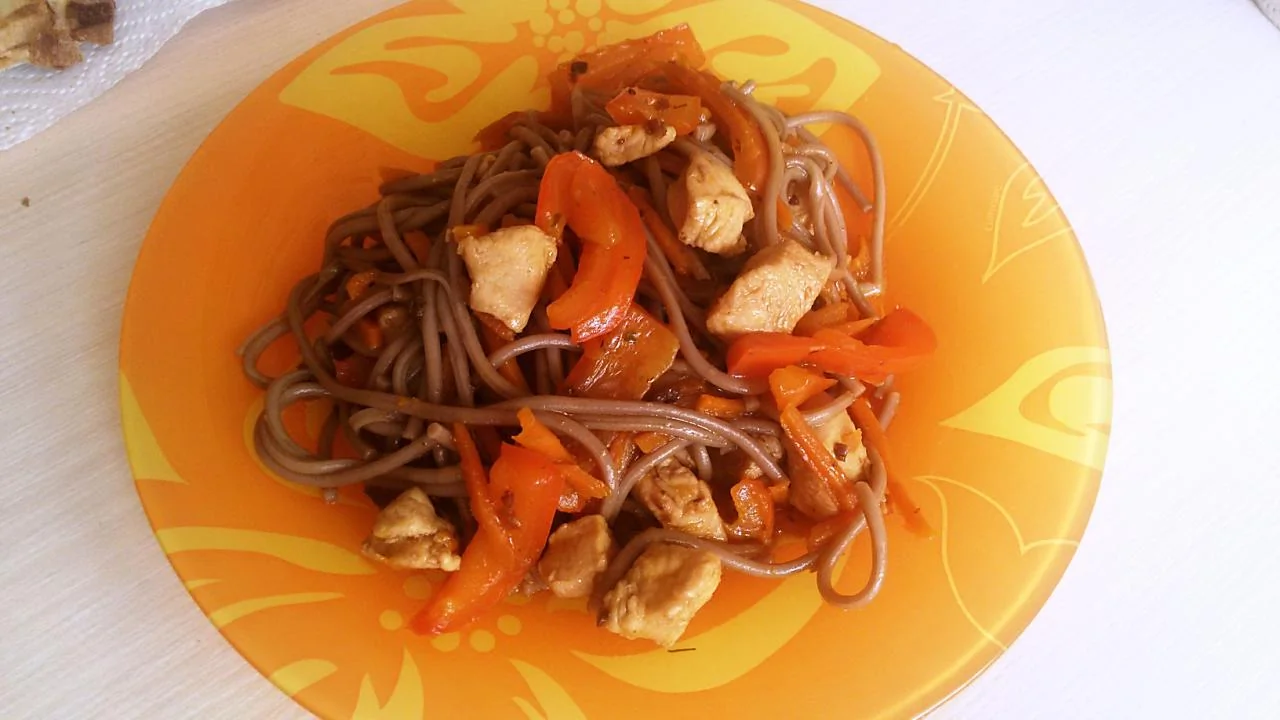ШАГ 3 Натрите соломкой морковь и болгарский перец, лук нарежьте полукольцами и обжарьте до момента когда морковь и перец станут мягкими. Добавите куриное филе и гречневую лапшу. Обжарьте 5 минут, добавьте кунжут и соевый соус по вкусу, готовьте еще 5 минут под крышкой.
